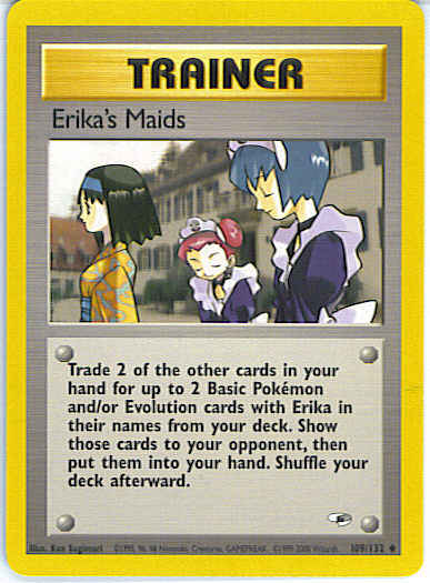 Trade 2 of the other cards in your hand for up to 2 Basic Pokemon and/or Evolution cards with Erika in their names from your deck. Show those cards to your opponent, then put them into your hand. Shuffle your deck afterward.