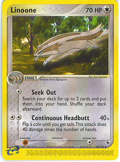 | Type | Colorless | | Pokemon serie | Ruby Sapphire | | Stadie | Stage 1 | | HP | 70 | | Sjældenhed | Uncommon | | Tilbagetrækning | 1 | | Svaghed | F | | Kortnummer | 38 | | Evne | [C] Seek Out - Search your deck for up to 2 cards and put them into your hand. Shuffle your deck afterward. [CC] Continuous Headbutt (40x) Flip a coin until you get tails. This attack does 40 damage times the number of heads.