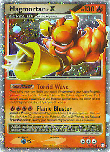 | Type | Fire | | Pokemon serie | Mysterious Treasures | | Stadie | Level Up | | HP | 130 | | Sjældenhed | Ultra-Rare | | Tilbagetrækning | 3 | | Svaghed | Wx2 | | Kortnummer | 123 | | Evne |