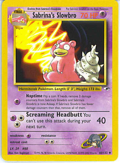 [P] Naptime - Flip a coin. If heads, remove 3 damage counters from Sabrina's Slowbro and Sabrina's Slowbro is now Asleep. If Sabrina's Slowbro has fewer damage counters than that, remove all of them.