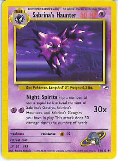 [PP] Night Spirits (30x) Flip a number of coins equal to the total number of Sabrina's Gastlys, Sabrina's Haunters, and Sabrina's Gengars you have in play. This attack does 30 damage times the number of heads.