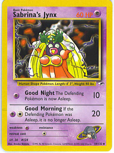 | Type | Psychic | | Pokemon serie | Gym Heroes | | Stadie | Basic | | HP | 60 | | Sjældenhed | Uncommon | | Tilbagetrækning | 1 | | Svaghed | P | | Kortnummer | 59 | | Evne |