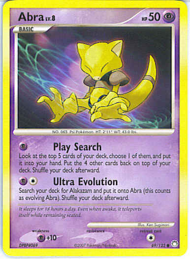 [CP] Ultra Evolution - Search your deck for Alakazam and put it onto Abra (this counts as evolving Abra). Shuffle your deck afterward.