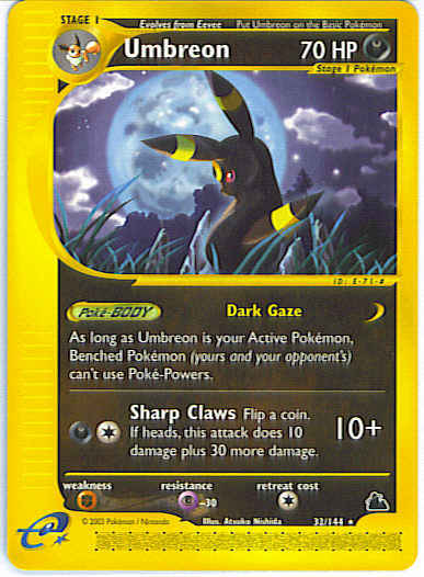 | Type | Darkness | | Pokemon serie | Skyridge | | Stadie | Stage 1 | | HP | 70 | | Sjældenhed | Rare | | Tilbagetrækning | 1 | | Modstand | P | | Svaghed | F | | Kortnummer | 32 | | Evne | [CD] Sharp Claws (10+) Flip a coin. If heads, this attack does 10 damage plus 30 more damage.