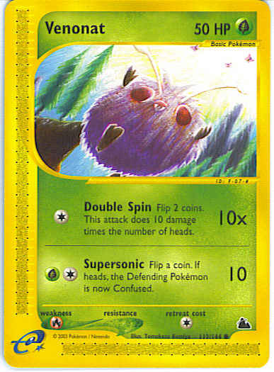| Type | Grass | | Pokemon serie | Skyridge | | Stadie | Basic | | HP | 50 | | Sjældenhed | Common | | Tilbagetrækning | 1 | | Svaghed | R | | Kortnummer | 112 | | Evne | [C] Double Spin (10x) Flip 2 coins. This attack does 10 damage times the number of heads. [CG] Supersonic (10) Flip a coin. If heads, the Defending Pokemon is now Confused.