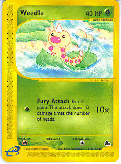 | Type | Grass | | Pokemon serie | Skyridge | | Stadie | Basic | | HP | 40 | | Sjældenhed | Common | | Tilbagetrækning | 1 | | Svaghed | R | | Kortnummer | 114 | | Evne | [G] Fury Attack (10x) Flip 3 coins. This attack does 10 damage times the number of heads.