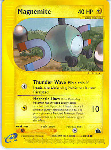 | | Evne2 | [C] Thunder Wave - Flip a coin. If heads, the Defending Pokemon is now Paralyzed. [L] Magnetic Lines (10) If the Defending Pokemon has any basic Energy cards attached to it, flip a coin. If heads, choose 1 of those Energy cards and move it to 1 of your opponent's Benched Pokemon. If your opponent has no Benched Pokemon, ignore this effect.