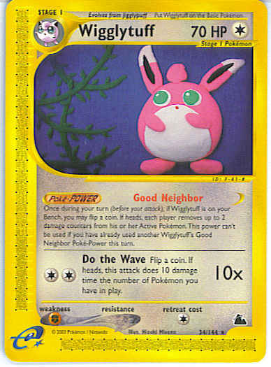 | Type | Colorless | | Pokemon serie | Skyridge | | Stadie | Stage 1 | | HP | 70 | | Sjældenhed | Rare | | Tilbagetrækning | 1 | | Svaghed | R | | Kortnummer | 34 | | Evne | [CCC] Do the Wave (10x) Flip a coin. If heads, this attack does 10 damage times the number of Pokemon you have in play.