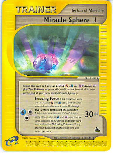 | Type | Trainer | | Pokemon serie | Skyridge | | Stadie | Trainer (Technical Machine) | | Sjældenhed | Uncommon | | Kortnummer | 130 | | Evne | [CCW] Freezing Force (30+) If the Pokemon using this attack has R and W basic Energy cards attached to it, this attack does 30 damage plus 10 more damage and the Defending Pokemon is now Burned. If the Pokemon using this attack has W and P basic Energy cards attached to it, choose an Energy card attached to the Defending Pokemon, if any, and your opponent shuffles that card into his or her deck.