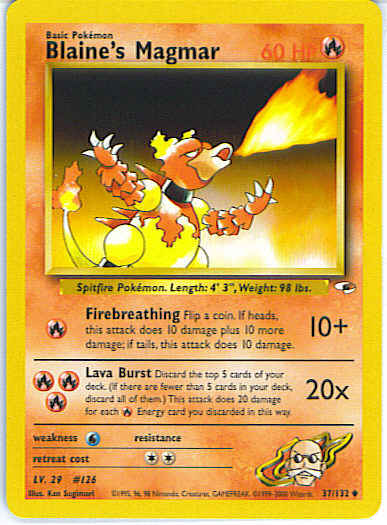 | Type | Fire | | Pokemon serie | Gym Heroes | | Stadie | Basic | | HP | 60 | | Sjældenhed | Uncommon | | Tilbagetrækning | 2 | | Svaghed | W | | Kortnummer | 37 | | Evne |