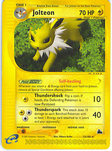 | Type | Lightning | | Pokemon serie | Skyridge | | Stadie | Stage 1 | | HP | 70 | | Sjældenhed | Rare | | Svaghed | F | | Kortnummer | 13 | | Evne | [L] Thundershock (10) Flip a coin. If heads, the Defending Pokemon is now Paralyzed. [CCL] Thunderspark (40) This attack does 10 damage to each Benched Pokemon with at least 1 Energy card attached to it (yours and your opponent's).