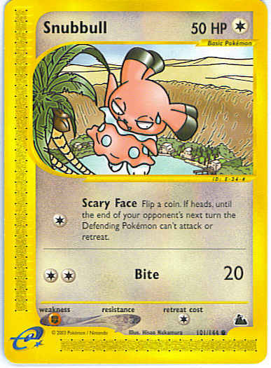 | Type | Colorless | | Pokemon serie | Skyridge | | Stadie | Basic | | HP | 50 | | Sjældenhed | Common | | Tilbagetrækning | 1 | | Svaghed | F | | Kortnummer | 101 | | Evne | [C] Scary Face - Flip a coin. If heads, until the end of your opponent's next turn the Defending Pokemon can't Retreat. [CC] Bite (20)