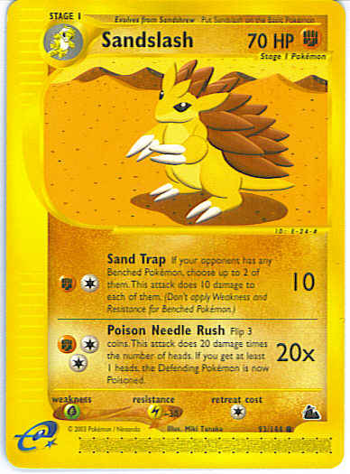 | Type | Fighting | | Pokemon serie | Skyridge | | Stadie | Stage 1 | | HP | 70 | | Sjældenhed | Common | | Tilbagetrækning | 1 | | Modstand | L | | Svaghed | G | | Kortnummer | 93 | | Evne | [CF] Sand Trap (10) If your opponent has any Benched Pokemon, choose up to 2 of them. This attack does 10 damage to each of them. (Don't apply Weakness and Resistance for Benched Pokemon.) [CCF] Poison Needle Rush (20x) Flip 3 coins. This attack does 20 damage times the number of heads. If you get at least 1 heads, the Defending Pokemon is now Poisoned.