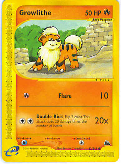 | Type | Fire | | Pokemon serie | Skyridge | | Stadie | Basic | | HP | 50 | | Sjældenhed | Common | | Tilbagetrækning | 1 | | Svaghed | W | | Kortnummer | 62 | | Evne | [R] Flare (10) [CC] Double Kick (20x) Flip 2 coins. This attack does 20 damage times the number of heads.