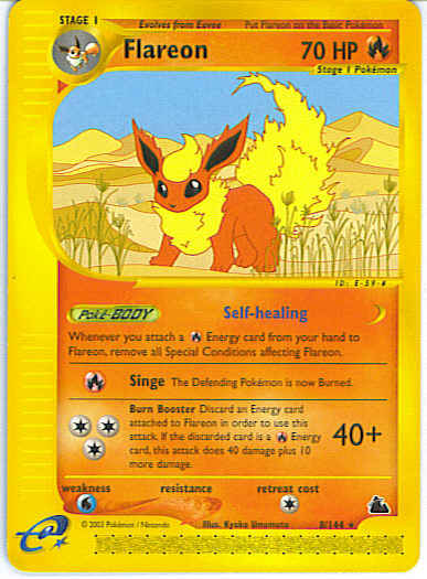 | Type | Fire | | Pokemon serie | Skyridge | | Stadie | Stage 1 | | HP | 70 | | Sjældenhed | Rare | | Tilbagetrækning | 1 | | Svaghed | W | | Kortnummer | 8 | | Evne | [R] Singe - The Defending Pokemon is now Burned. [CCC] Burn Booster (40+) Discard an Energy card attached to Flareon in order to use this attack. If the discarded card is a R Energy card, this attack does 40 damage plus 10 more damage.