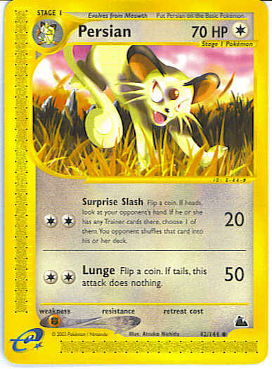| Type | Colorless | | Pokemon serie | Skyridge | | Stadie | Stage 1 | | HP | 70 | | Sjældenhed | Uncommon | | Svaghed | F | | Kortnummer | 42 | | Evne | [CC] Surprise Slash (20) Flip a coin. If heads look at your opponent's hand. If he or she has any Trainer cards there, choose 1 of them. Your opponent shuffles that card into his or her deck. [CC] Lunge (50) Flip a coin. If tails, this attack does nothing.