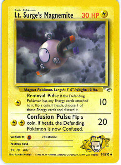 | Type | Lightning | | Pokemon serie | Gym Heroes | | Stadie | Basic | | HP | 30 | | Sjældenhed | Uncommon | | Tilbagetrækning | 2 | | Svaghed | F | | Kortnummer | 50 | | Evne |