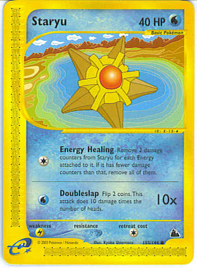 | Type | Water | | Pokemon serie | Skyridge | | Stadie | Basic | | HP | 40 | | Sjældenhed | Common | | Tilbagetrækning | 1 | | Svaghed | L | | Kortnummer | 103 | | Evne | [C] Energy Healing - Remove 2 damage counters from Staryu for each energy attached to it. If it has fewer damage counters than that, remove all of them. [W] Doubleslap (10x) Flip 2 coins. This attack does 10 damage times the number of heads.