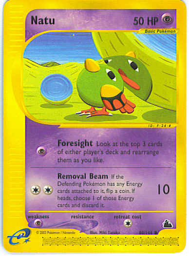 | | Evne2 | [P] Foresight - Look at the top 3 cards of either player's deck and rearrange them as you like. [CC] Removal Beam (10) If the Defending Pokemon has any Energy cards attached to it, flip a coin. If heads, choose one of those Energy cards and discard it.