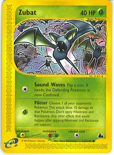 | Type | Grass | | Pokemon serie | Skyridge | | Stadie | Basic | | HP | 40 | | Sjældenhed | Common | | Tilbagetrækning | 1 | | Modstand | F | | Svaghed | L | | Kortnummer | 117 | | Evne | [C] Sound Waves - Flip a coin. If heads, the Defending Pokemon is now Confused. [G] Flitter - Choose 1 of your opponent's Pokemon. This attack does 10 damage to that Pokemon. Don't apply Weakness and Resistance. (Any other effects that would happen after applying Weakness and Resistance still happen.)