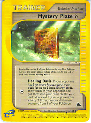 | Type | Trainer | | Pokemon serie | Skyridge | | Stadie | Trainer (Technical Machine) | | Sjældenhed | Uncommon | | Kortnummer | 136 | | Evne | [C] Healing Oasis - If your opponent has 5 or more Prizes, search your deck for up to 3 basic Energy cards, show them to your opponent, and put them into your hand. Shuffle your deck afterward. If your opponent has exactly 2 Prizes, remove all damage counters from 1 of your Pokemon.