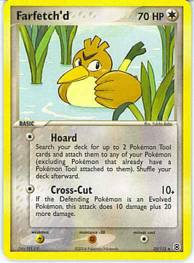 | Type | Colorless | | Pokemon serie | Fire Red Leaf Green | | Stadie | Basic | | HP | 70 | | Sjældenhed | Rare | | Tilbagetrækning | 1 | | Modstand | F | | Svaghed | L | | Kortnummer | 23 | | Evne | [C] Hoard - Search your deck for up to 2 Pokemon Tool cards and attach them to any of your Pokemon (excluding Pokemon that already have a Pokemon Tool attached to them). Shuffle your deck afterward. [C] Cross-Cut (10+) If the Defending Pokemon is an Evolved Pokemon, this attack does 10 damage plus 20 more damage. | | Evne2 | [C] Hoard - Search your deck for up to 2 Pokemon Tool cards and attach them to any of your Pokemon (excluding Pokemon that already have a Pokemon Tool attached to them). Shuffle your deck afterward. [C] Cross-Cut (10+) If the Defending Pokemon is an Evolved Pokemon, this attack does 10 damage plus 20 more damage. | | Kunstner | Yukiko Baba |