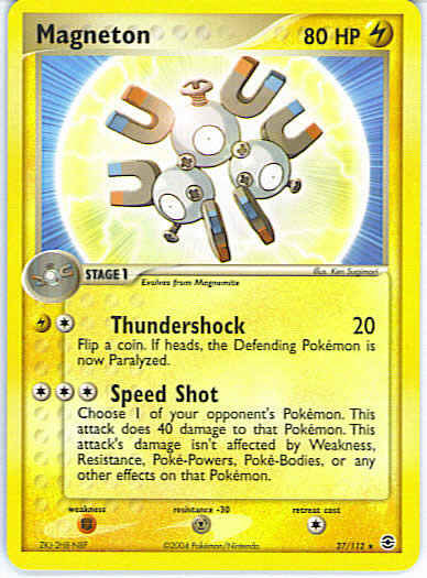 | Type | Lightning | | Pokemon serie | Fire Red Leaf Green | | Stadie | Stage 1 | | HP | 80 | | Sjældenhed | Rare | | Tilbagetrækning | 1 | | Modstand | M | | Svaghed | F | | Kortnummer | 27 | | Evne | [CL] Thundershock (20) Flip a coin. If heads, the Defending Pokemon is now Paralyzed. [CCC] Speed Shot - Choose 1 of your opponent's Pokemon. This attack does 40 damage to that Pokemon. This attack's damage isn't affected by Weakness, Resistance, Poke-Powers, Poke-Bodies, or any other effects on that Pokemon. | | Evne2 | [CL] Thundershock (20) Flip a coin. If heads, the Defending Pokemon is now Paralyzed. [CCC] Speed Shot - Choose 1 of your opponent's Pokemon. This attack does 40 damage to that Pokemon. This attack's damage isn't affected by Weakness, Resistance, Poke-Powers, Poke-Bodies, or any other effects on that Pokemon. | | Kunstner | Ken Sugimori |