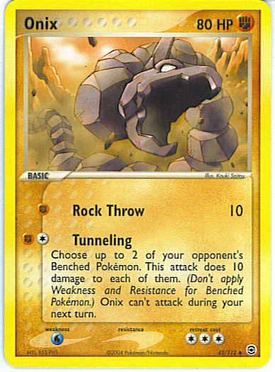 | Type | Fighting | | Pokemon serie | Fire Red Leaf Green | | Stadie | Basic | | HP | 80 | | Sjældenhed | Uncommon | | Tilbagetrækning | 3 | | Svaghed | W | | Kortnummer | 42 | | Evne | [F] Rock Throw (10) [CF] Tunneling - Choose up to 2 of your opponent's Benched Pokemon. This attack does 10 damage to each of them. (Don't apply Weakness and Resistance for Benched Pokemon.) Onix can't attack during your next turn. | | Evne2 | [F] Rock Throw (10) [CF] Tunneling - Choose up to 2 of your opponent's Benched Pokemon. This attack does 10 damage to each of them. (Don't apply Weakness and Resistance for Benched Pokemon.) Onix can't attack during your next turn. | | Kunstner | Kouki Saitou |