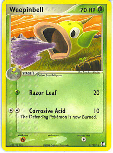 | Type | Grass | | Pokemon serie | Fire Red Leaf Green | | Stadie | Stage 1 | | HP | 70 | | Sjældenhed | Uncommon | | Tilbagetrækning | 1 | | Svaghed | R | | Kortnummer | 51 | | Evne | [G] Razor Leaf (20) [CC] Corrosive Acid (10) The Defending Pokemon is now Burned. | | Evne2 | [G] Razor Leaf (20) [CC] Corrosive Acid (10) The Defending Pokemon is now Burned. | | Kunstner | Tomokazu Komiya |
