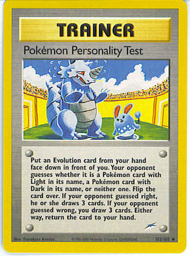 Choose 1 Evolution card in your hand and put it face down in front of you. Your opponent must guess if it is a Dark Pokemon, Gentle Pokemon, or an "other" Pokemon. When your opponent guesses, turn the card over. If your opponent is correct, he or she draws 3 cards. If he or she is incorrect, you draw 3 cards. Either way, return the card in front of you to your hand. If you don't have an Evolution card in your hand, you can't play this card.