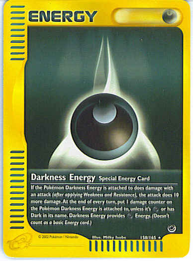If the Pokemon Darkness Energy is attached to does damage with an attack (after applying Weakness and Resistance), the attack does 10 more damage. At the end of every turn, put 1 damage counter on the Pokemon Darkness Energy is attached to, unless it's D or has Dark in its name. Darkness Energy provides D Energy. (Doesn't count as a basic Energy card.)
