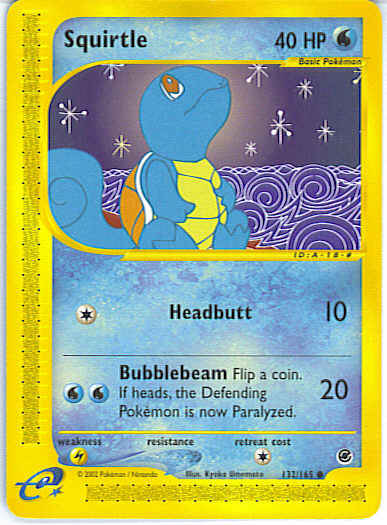 | Type | Water | | Pokemon serie | Expedition | | Stadie | Basic | | HP | 40 | | Sjældenhed | Common | | Tilbagetrækning | 1 | | Svaghed | L | | Kortnummer | 132 | | Evne |