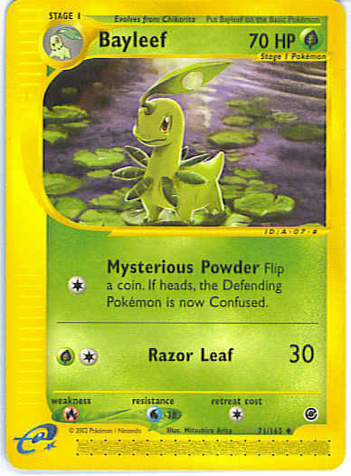 | Type | Grass | | Pokemon serie | Expedition | | Stadie | Stage 1 | | HP | 70 | | Sjældenhed | Uncommon | | Tilbagetrækning | 1 | | Modstand | W | | Svaghed | R | | Kortnummer | 71 | | Evne |