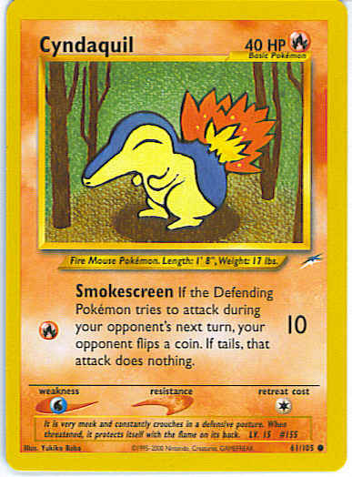 | Type | Fire | | Pokemon serie | Neo Destiny | | Stadie | Basic | | HP | 40 | | Sjældenhed | Common | | Tilbagetrækning | 1 | | Svaghed | W | | Kortnummer | 61 | | Evne |