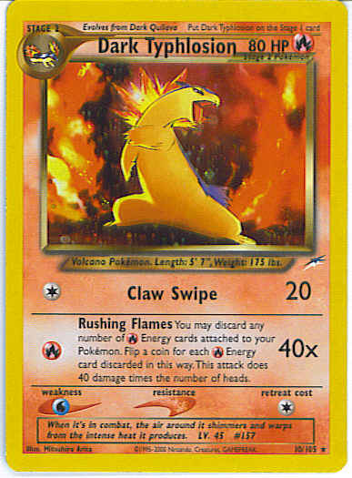 | Type | Fire | | Pokemon serie | Neo Destiny | | Stadie | Stage 2 | | HP | 80 | | Sjældenhed | Rare | | Tilbagetrækning | 1 | | Svaghed | W | | Kortnummer | 10 | | Evne |
