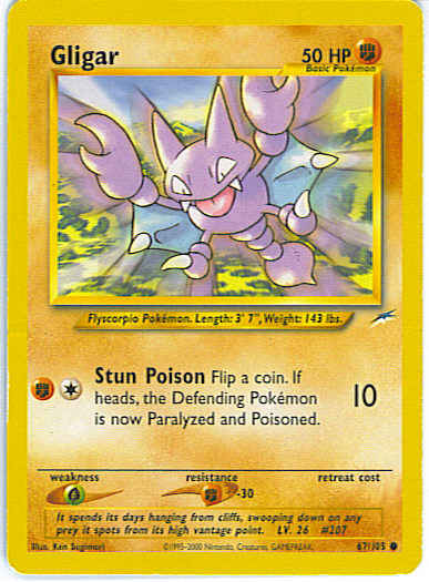 | Type | Fighting | | Pokemon serie | Neo Destiny | | Stadie | Basic | | HP | 50 | | Sjældenhed | Common | | Modstand | F | | Svaghed | G | | Kortnummer | 67 | | Evne |