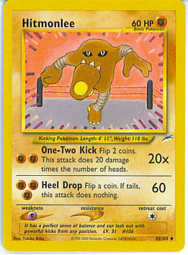 | Type | Fighting | | Pokemon serie | Neo Destiny | | Stadie | Basic | | HP | 60 | | Sjældenhed | Uncommon | | Tilbagetrækning | 1 | | Svaghed | P | | Kortnummer | 42 | | Evne |