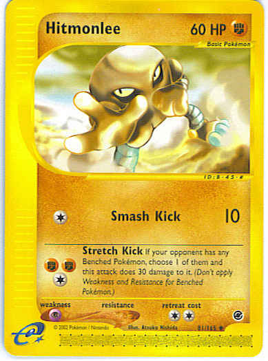 | Type | Fighting | | Pokemon serie | Expedition | | Stadie | Basic | | HP | 60 | | Sjældenhed | Uncommon | | Tilbagetrækning | 2 | | Svaghed | P | | Kortnummer | 81 | | Evne |