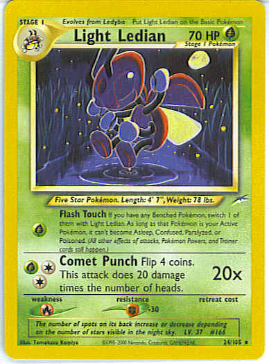| Type | Grass | | Pokemon serie | Neo Destiny | | Stadie | Stage 1 | | HP | 70 | | Sjældenhed | Rare | | Modstand | F | | Svaghed | R | | Kortnummer | 24 | | Evne |