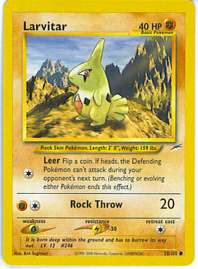 | Type | Fighting | | Pokemon serie | Neo Destiny | | Stadie | Basic | | HP | 40 | | Sjældenhed | Common | | Tilbagetrækning | 1 | | Modstand | L | | Svaghed | G | | Kortnummer | 70 | | Evne |