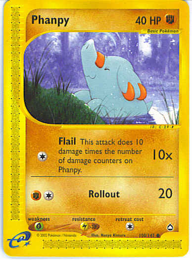 | Type | Fighting | | Pokemon serie | Aquapolis | | Stadie | Basic | | HP | 40 | | Sjældenhed | Common | | Tilbagetrækning | 1 | | Modstand | L | | Svaghed | G | | Kortnummer | 100 | | Evne | [C] Flail (10x) Does 10 damage times the number of damage counters on Phanpy. [CF] Rollout (20)