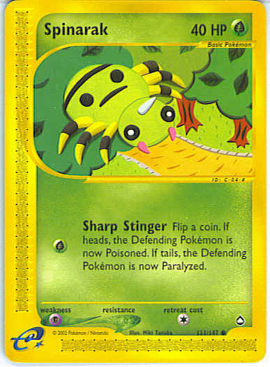 | Type | Grass | | Pokemon serie | Aquapolis | | Stadie | Basic | | HP | 40 | | Sjældenhed | Common | | Tilbagetrækning | 1 | | Svaghed | P | | Kortnummer | 111 | | Evne | [G] Sharp Stinger - Flip a coin. If heads, the Defending Pokemon is now Poisoned. If tails, the Defending Pokemon is now Paralyzed.