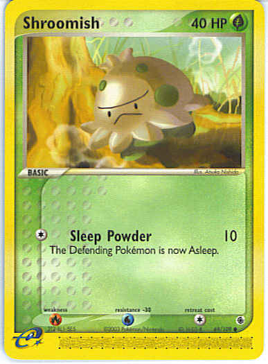 | Type | Grass | | Pokemon serie | Ruby Sapphire | | Stadie | Basic | | HP | 40 | | Sjældenhed | Common | | Tilbagetrækning | 1 | | Svaghed | R | | Kortnummer | 69 | | Evne | [C] Sleep Powder (10) The Defending Pokemon is now Asleep.
