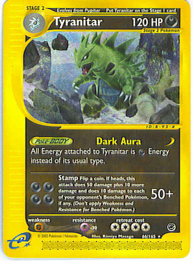 | Type | Darkness | | Pokemon serie | Expedition | | Stadie | Stage 2 | | HP | 120 | | Sjældenhed | Rare | | Tilbagetrækning | 4 | | Modstand | P | | Svaghed | F | | Kortnummer | 66 | | Evne |
