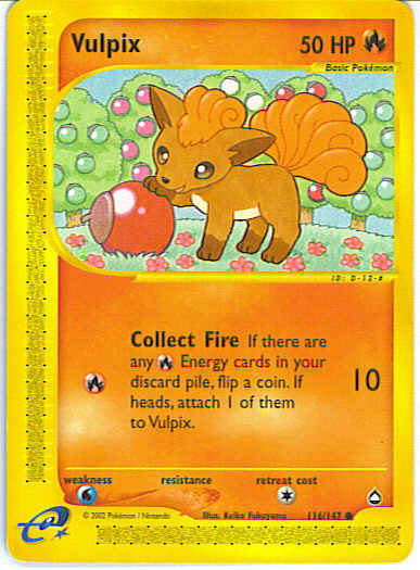 | Type | Fire | | Pokemon serie | Aquapolis | | Stadie | Basic | | HP | 50 | | Sjældenhed | Common | | Tilbagetrækning | 1 | | Svaghed | W | | Kortnummer | 116 | | Evne | [R] Collect Fire (10) If there are any R Energy cards in your discard pile, flip a coin. If heads, attach 1 of those Energy cards to Vulpix.