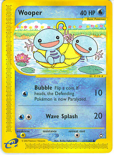 | Type | Water | | Pokemon serie | Aquapolis | | Stadie | Basic | | HP | 40 | | Sjældenhed | Common | | Tilbagetrækning | 1 | | Svaghed | L | | Kortnummer | 117 | | Evne | [W] Bubble (10) Flip a coin. If heads, the Defending Pokemon is now Paralyzed. [CW] Wave Splash (20)