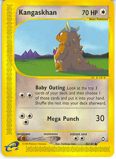 | Type | Colorless | | Pokemon serie | Aquapolis | | Stadie | Basic | | HP | 70 | | Sjældenhed | Common | | Tilbagetrækning | 2 | | Svaghed | F | | Kortnummer | 88 | | Evne | [CC] Baby Outing - Look at the top 3 cards of your deck. Put 1 of those cards in your hand and shuffle the rest into your deck. [CCC] Mega Punch (30)