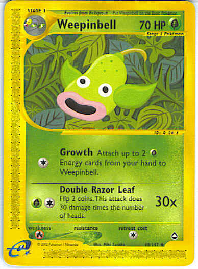 | Type | Grass | | Pokemon serie | Aquapolis | | Stadie | Stage 1 | | HP | 70 | | Sjældenhed | Uncommon | | Tilbagetrækning | 1 | | Svaghed | R | | Kortnummer | 65 | | Evne | [C] Growth - You may attach up to 2 G Energy cards from your hand to Weepinbell. [CG] Double Razor Leaf (30x) Flip 2 coins. This attack does 30 damage times the number of heads.