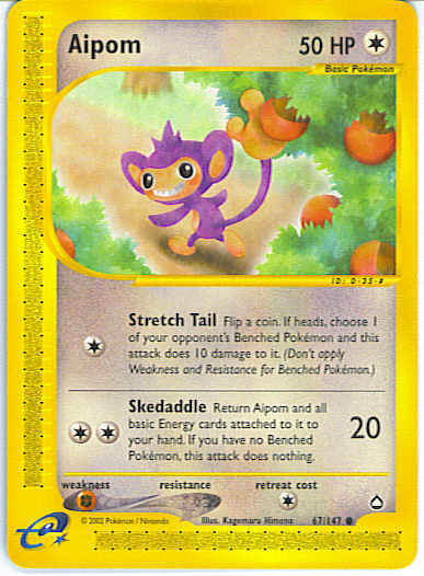 | Type | Colorless | | Pokemon serie | Aquapolis | | Stadie | Basic | | HP | 50 | | Sjældenhed | Common | | Tilbagetrækning | 1 | | Svaghed | F | | Kortnummer | 67 | | Evne | [C] Stretch Tail - If your opponent has any Benched Pokemon, flip a coin. If heads, choose 1 them and this attack does 10 damage to it. Don't apply Weakness and Resistance. [CC] Skedaddle (20) Shuffle Aipom and all basic Energy cards attached to it into your deck. (Discard all other cards attached to Aipom.) (If you have no Benched Pokemon, this attack does nothing.)