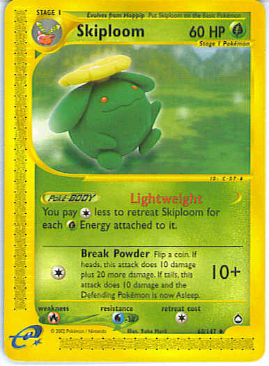 | Type | Grass | | Pokemon serie | Aquapolis | | Stadie | Stage 1 | | HP | 60 | | Sjældenhed | Uncommon | | Tilbagetrækning | 1 | | Modstand | W | | Svaghed | R | | Kortnummer | 60 | | Evne | [C] Break Powder (10+) Flip a coin. If heads, this attack does 10 damage plus 20 more damage. If tails, the Defending Pokemon is now Asleep.